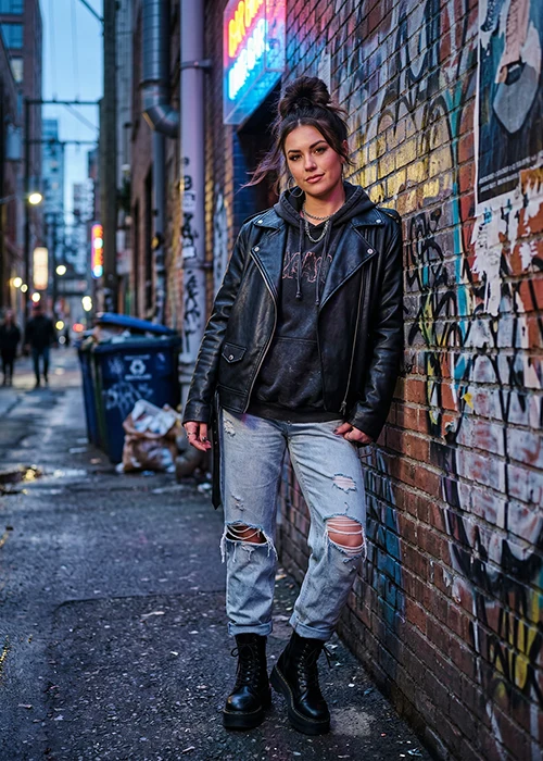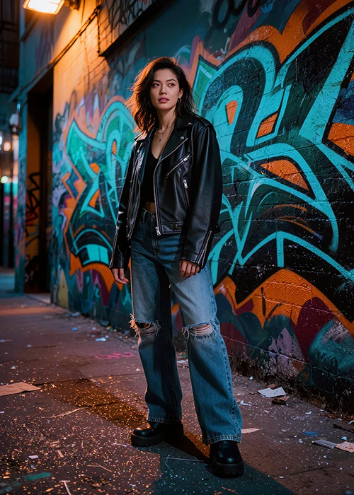 A confident female commercial model in edgy urban streetwear, standing against a graffiti-covered brick wall in a gritty city alley, dramatic side lighting from neon signs casting bold shadows, fashionable outfit with leather jacket and distressed denim, styled hair catching the ambient city glow, direct eye contact with camera creating powerful connection, raw urban energy and modern street culture aesthetic in a photorealism, confident, bold, edgy style, viewed from a medium-shot, eye-level-shot, shot on canon-eos-5d-mark-iv, twilight lighting, at dusk, with a urban, gritty, contemporary vibe, accented by city-lights, neon-glow, dramatic-shadows, rim-lighting, featuring high-contrast-colors, teal-and-orange, tetrachromatic, teal, orange, charcoal, bold, urban, with leather, concrete, matte-weathered-surfaces, glowing-neon --v 6.1 --ar 4:5 --c 5 --w 0 --q 1 --s 150 keypromptninja